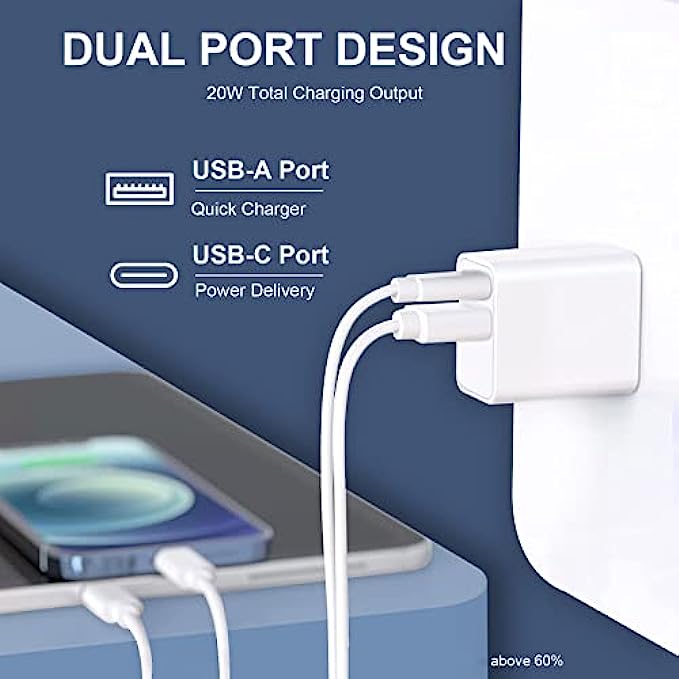 • 【The USB-C Port】20Watt Type-C PD Power Delivery use the latest generation fast charging technology,Charge 3X faster than the 5W charger, you can charge for iPhone 13 from 0 to 50% in about 30 minutes ( Fast charging List: for iPhone 13 / 12 / Pro / Max / Mini, 11 / XS / X / XR / 8 / 8 Plus, More)
