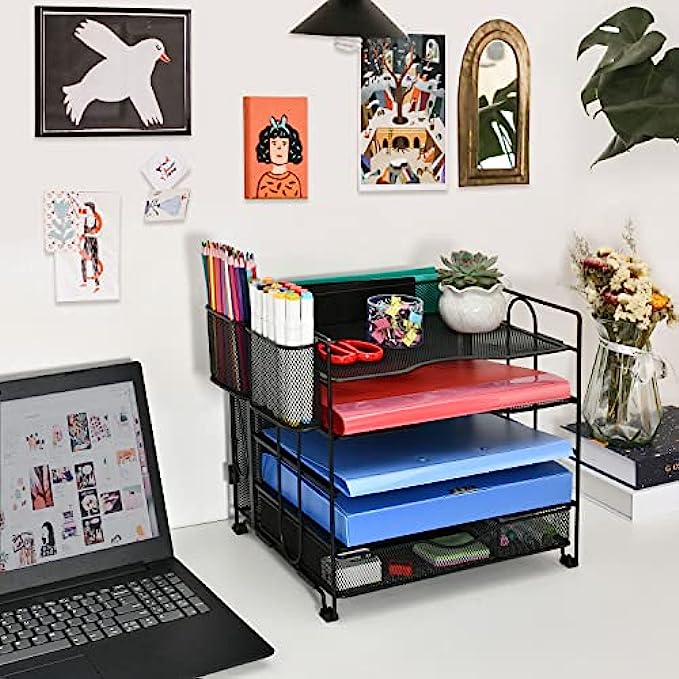 【New Upgraded Design】Unique 5 Tier paper shelves design and one vertical file storage layer on the back, with 1 extra sliding drawer and 2 extra pen holders (can be hung on or use separately) , totally an all-in-one desk organizer.