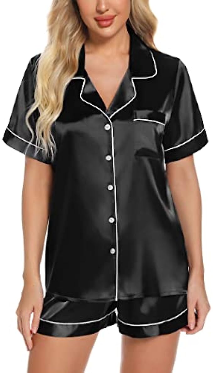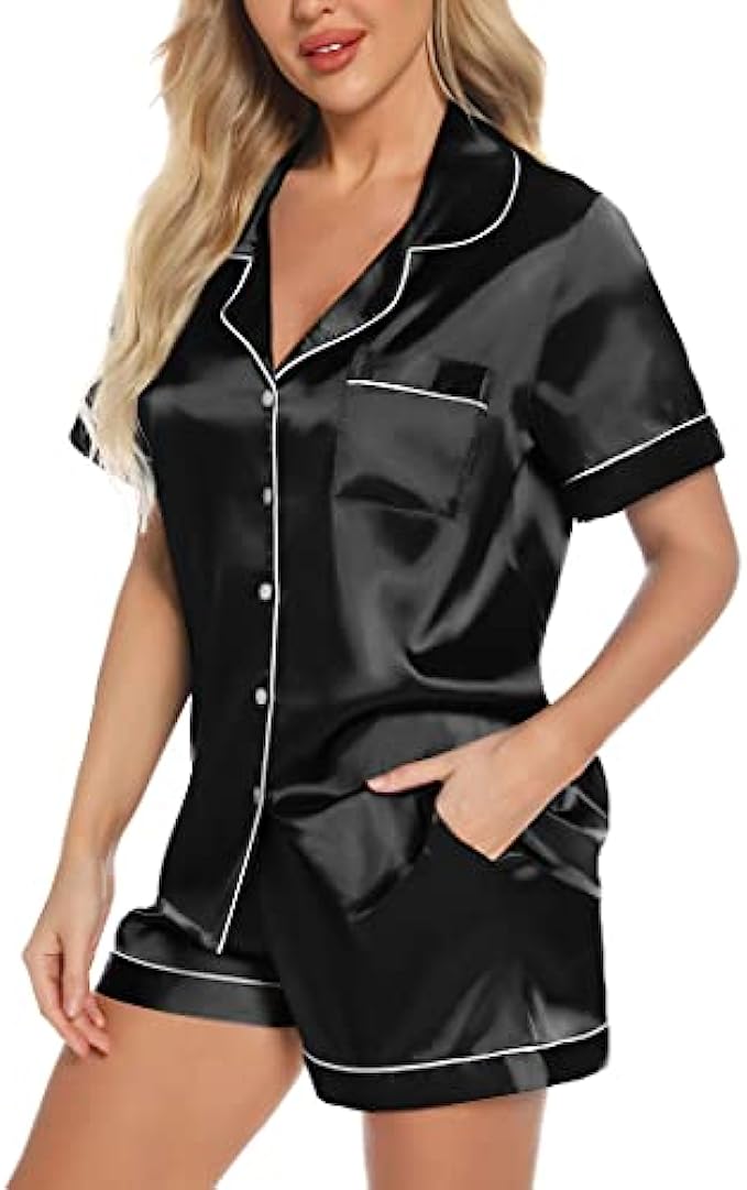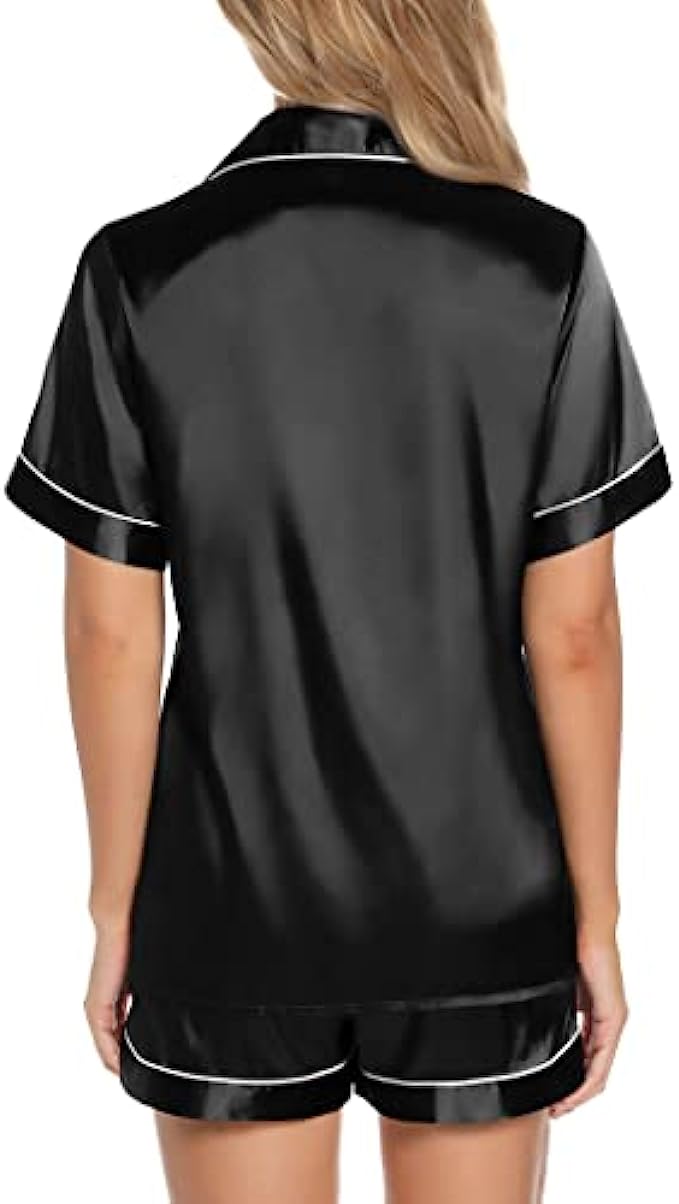 Anjue Silk Satin Pajamas Set Women’s Short Sleeve Sleepwear Soft Pjs Shorts Set Two Piece Button Down Pj Set S-XXL