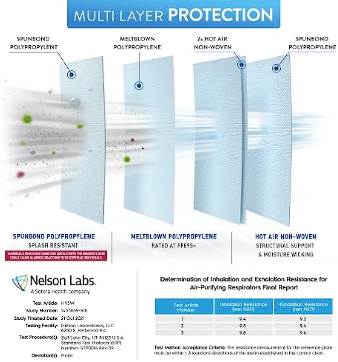 • Superior Protection & Breathability - BNX’s 5-layer filtration technology provides maximum protection, comfort and breathability. The active filter layer of these N95 masks is composed of ultra-high grade electrostatically charged meltblown polypropylene. Extremely breathable up to 50%+ more breathable than NIOSH minimum requirement.