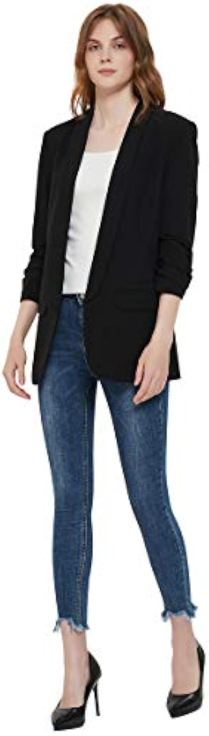 Charis Allure Womens 3/4 Ruched Sleeve Blazer Jacket Lightweight Work Office Open Front Solid Coat, Black