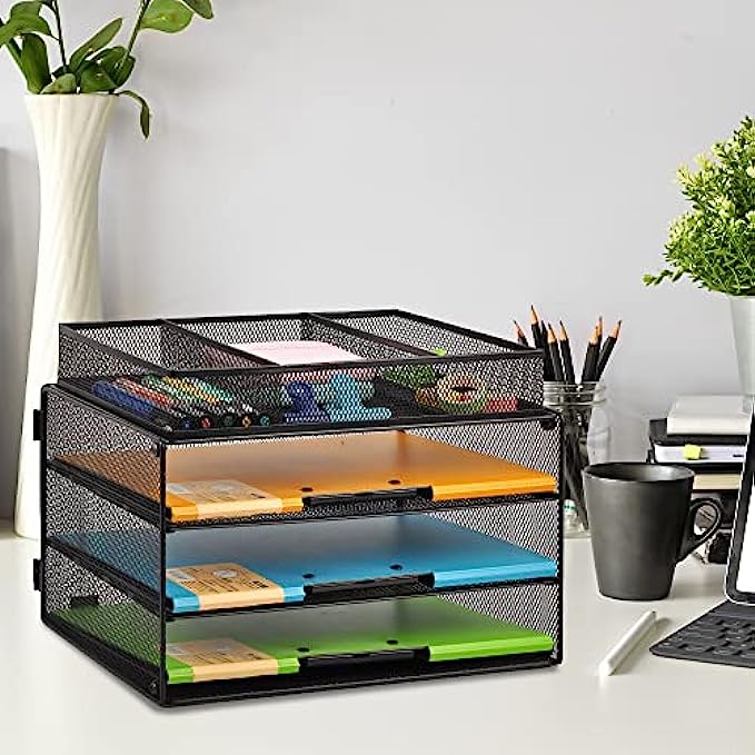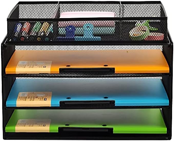 GDINDINFAN Paper Letter Tray Organizer, 3 Tier Mesh File Tray Desktop Paper Sorter with Drawer, Black