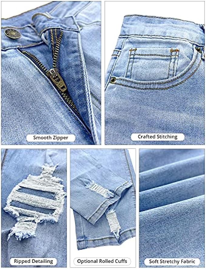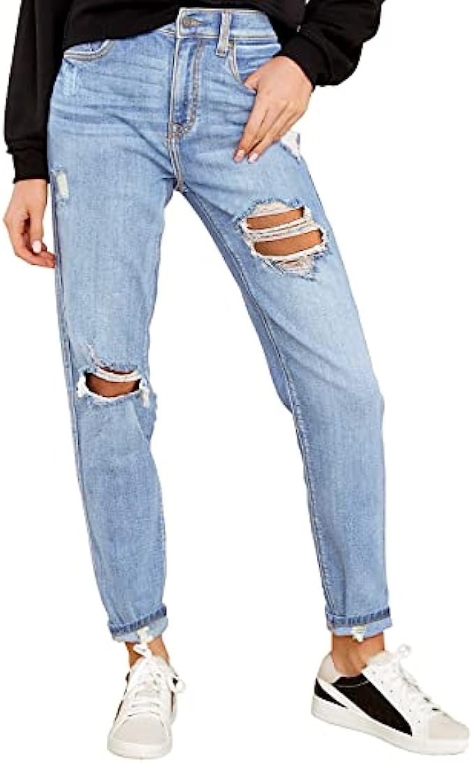 • These high rise distressed jeans for women are featured in relaxed fit, tapered leg and ankle length with optional rolled cuffs. Stretchy mom jeans are sure to flatter your curves perfectly.