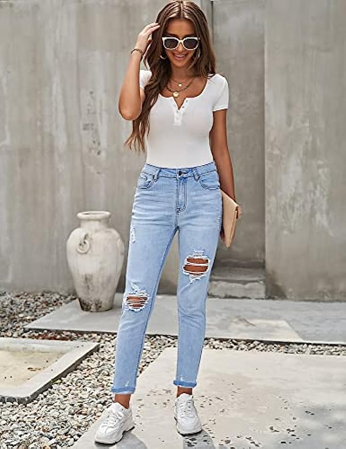 GRAPENT Women’s Casual High Waisted Mom Jeans Ripped Stretchy Tapered Denim Pants