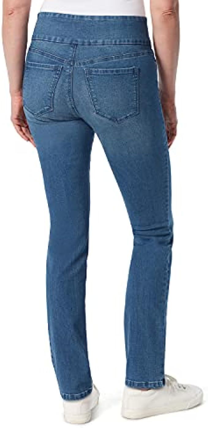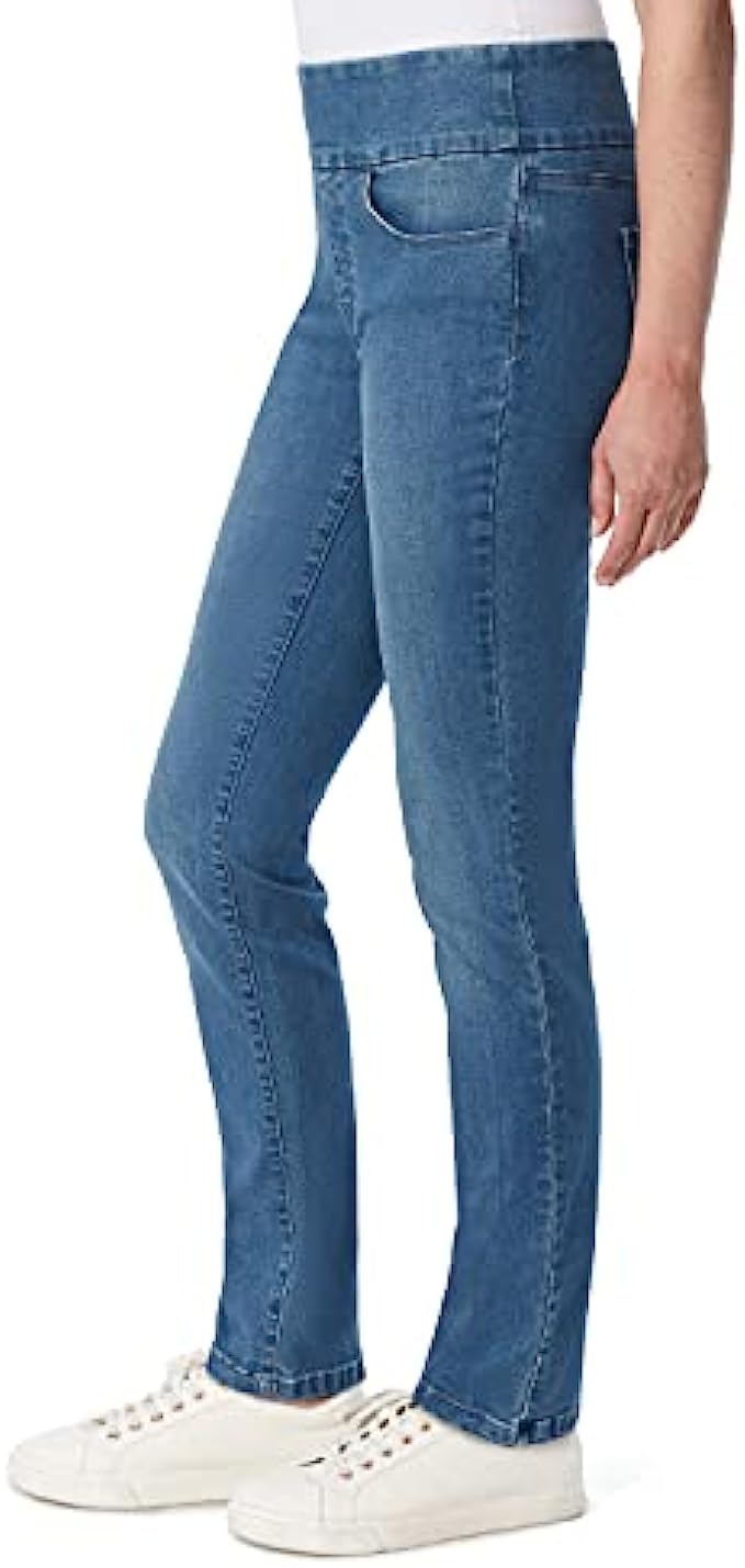 66% Cotton, 28% Polyester, 4% Other Fiber, 2% Spandex Imported Pull On closure Machine Wash STYLE - One Step pull on high rise jean sits at natural waist with hidden elastic comfort band, functional pockets and mock fly. VERSATILITY - Goes great with all tops from fashionable to basic tee shirts and all footwear from your favorite flats to stylish heels. LENGTH - This high waist pant comes in a 29 inch inseam with a 13 3/4 inch leg opening