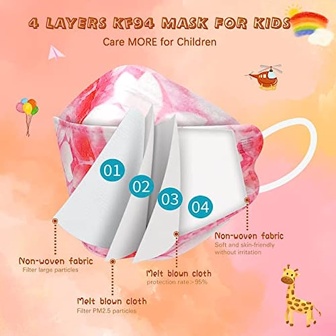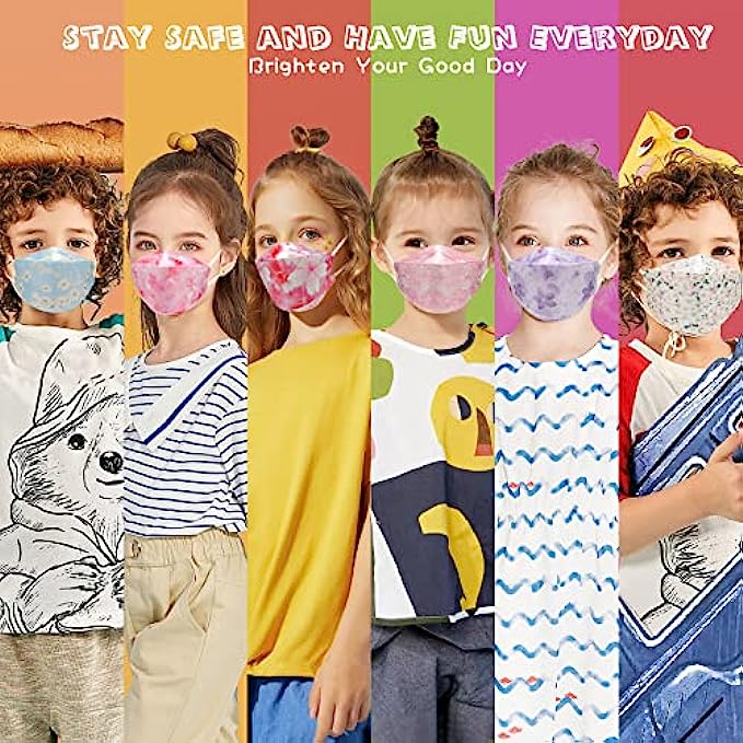 Ear Loop closure 【Exclusive Design】: The KF94 fish mouth design can form a perfect wrap from the chin to the bridge of the nose without leaving a gap. At the same time, it can prevent the mouth from contacting the mask, which increases the safety level and has the best wearing feeling. 【Product Introduction】: kids disposable face masks,The folding specification is :17*7CM, the unfolding is :17*15 CM, four layers of protection, can be close to the face, get the best protection effect, the ear hook is 6CM, the longest stretch is 18CM, and the elasticity is excellent. 【Four-layer Material】: the outermost layer is made of printed non-woven fabric, and the middle layer is made of two layers of melt-blown fabric, which can effectively prevent PM2.5 and protects up to 95%. The last layer is made of skin-friendly non-woven fabric, which fits the face without hurting the skin . 【Strong air Permeability】: Because the fish mouth shape design reserves a larger breathing space, a part of the air is reserved in the empty slot. This design will have better air permeability than ordinary masks and easier to breathe. Glasses will not be so Foggy. 【You Will Get】: 6 patterns, each 10 pieces individually packaged, a total of 6 packs (60 pieces)