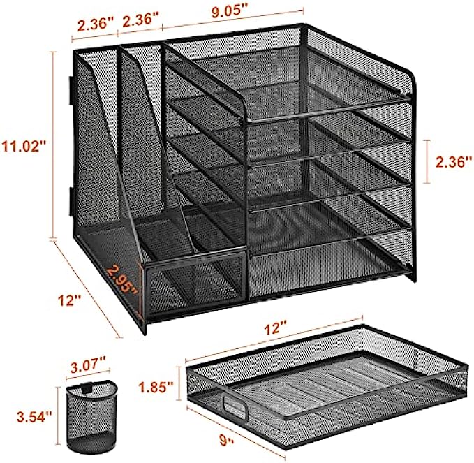 • ?【Space Saving】All office document folders would be organized by the vertical file holder. The paper tray organizer is very suitable for storing books, magazines, letters, and A4 paper. The drawer organizer and hanging pen holder enough accommodate all office supply accessories, such as pens, pencils, scissors, and so on. Perfect Size: 13.8*11*12inch.