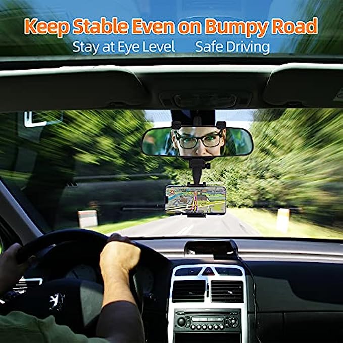 • Rear View Mirror Phone Mount: Great Mount Position for Phone Car Holder, The car phone holder securely stay at eye level, no looking down or blocking your view, keeping dashboard, windshield, and cup holder slot clear