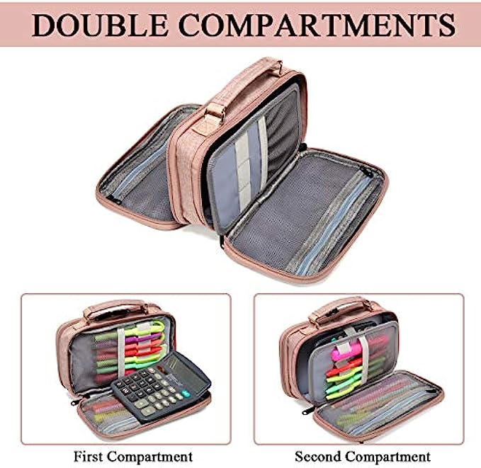• ✎EASY TO ORGANIZE:The large main compartment is ideal for pens, pencils, and markers or your phone with the elastic strap.It includes a small mesh pocket handy for erasers and other small items that might otherwise get buried. The other zipper compartment allows easy access to frequently-used items like rulers and scissors.Two mesh pockets can store other small items.The mesh pockets can keep lead, cards, and other accessories in order.