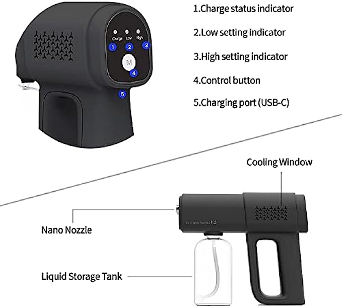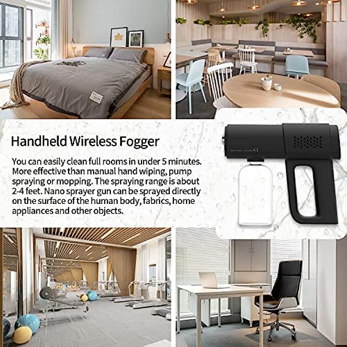 • 【Handheld Wireless Fogger】You can easily clean full rooms in under 5 minutes. More effective than manual hand wiping, pump spraying or mopping. The spraying range is about 2-4 feet. Nano sprayer gun can be sprayed directly on the surface of the human body, fabrics, home appliances and other objects.