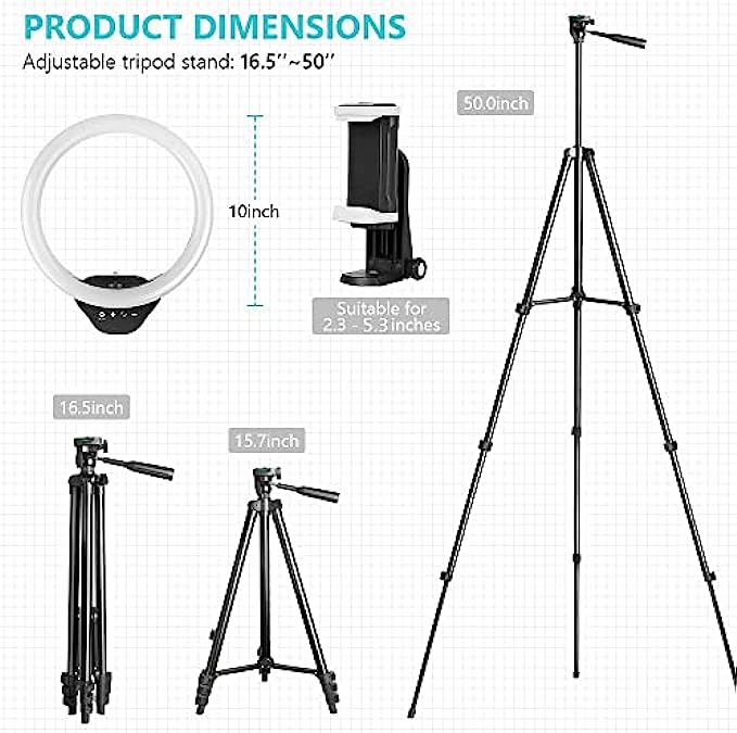 【Fully customizable portable tripod Stand】 Extending from 15.7 inches to 50 inches, our tripod can be adjusted to any height within seconds as needed, short enough to stand on tabletop, tall enough to fit your height. This compact circle light set comes handy when you do makeup, artworks, beauty & fashion live streaming, video calls and more.