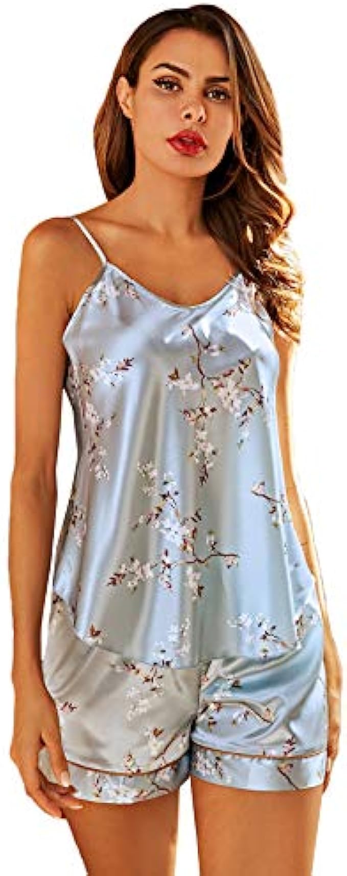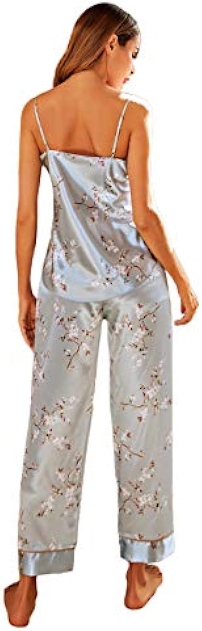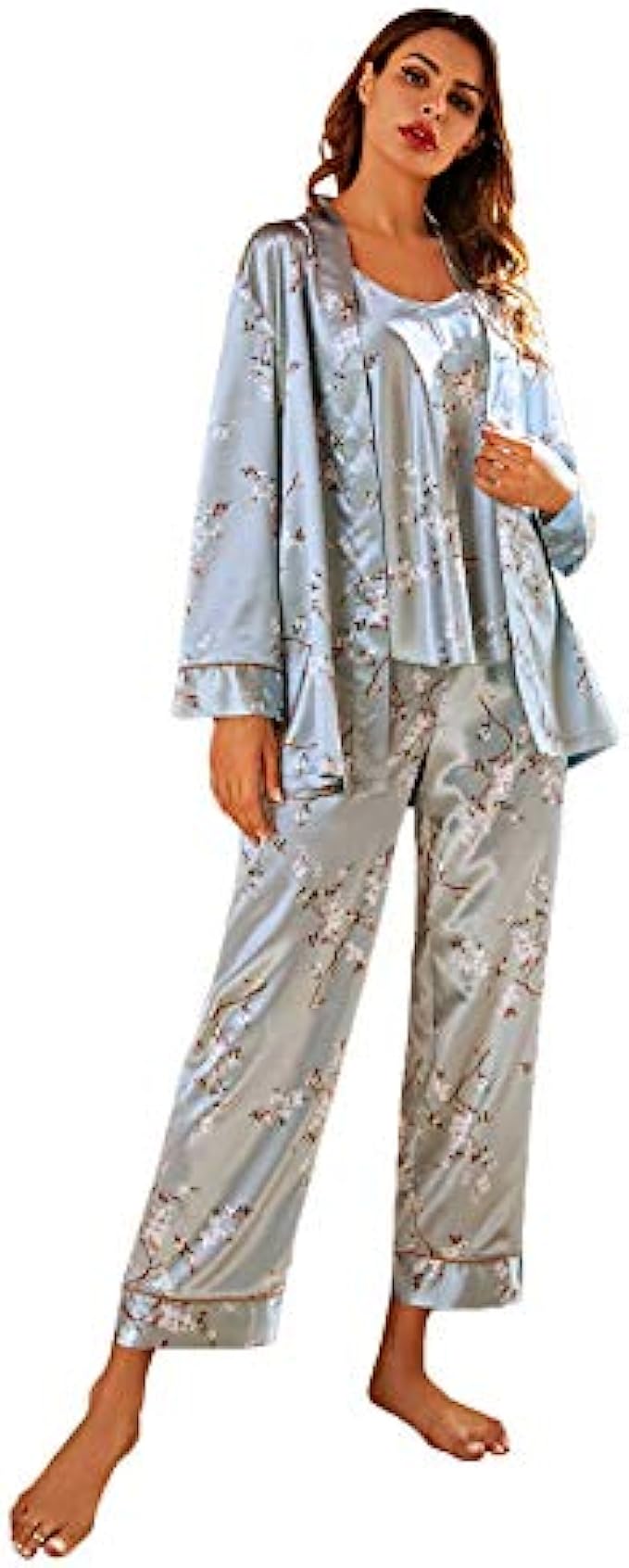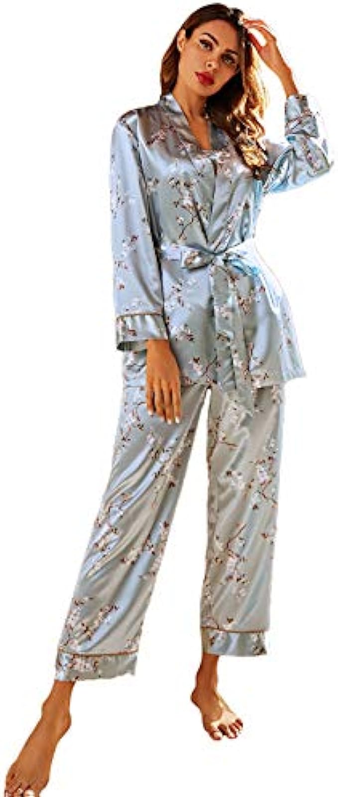 SheIn Women’s 4 Piece Floral Cami Top and Shorts Pants Satin Pajama Set with Belted Robe
