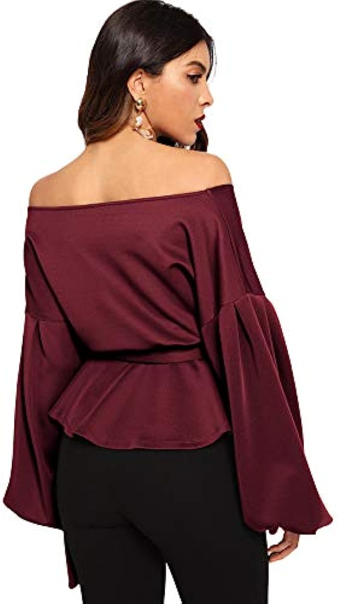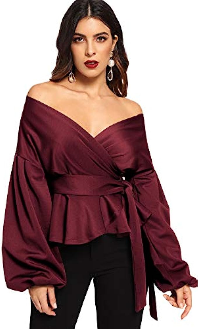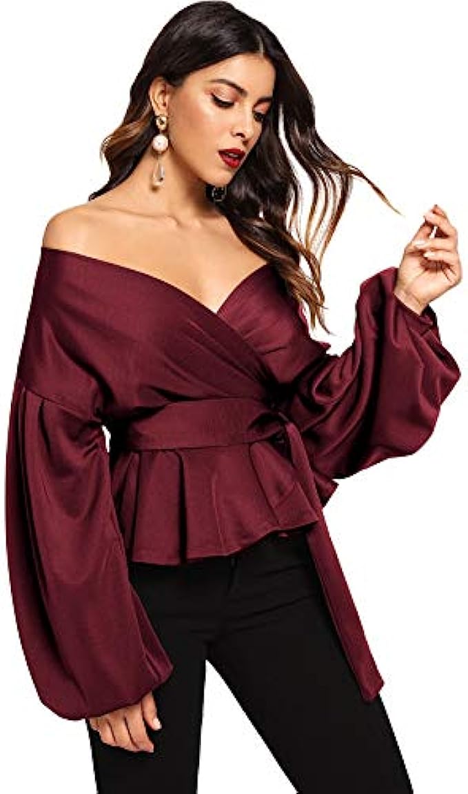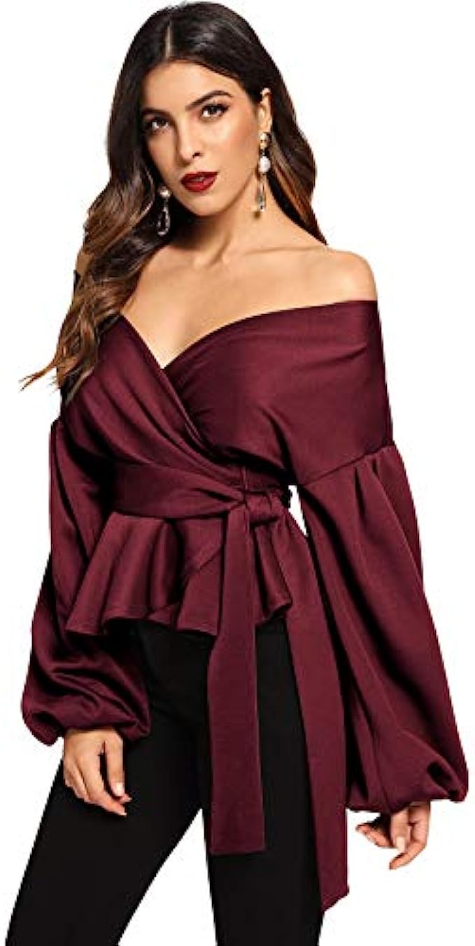 SheIn Women’s Long Sleeve V Neck Ruffle Blouse Off Shoulder Tie Waist Wrap Tops