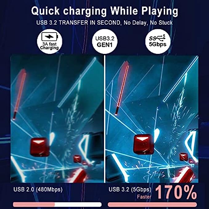 • 【Quickly Data Sync & Charging Speed】This quest link cable usb c to usb c supports USB 3.2 Gen 1 with 5Gbps stable and high-speed data transmission. No lag and Low latency. 3A fast charge VR headsets while playing simultaneously. No power worries and saving charging time.