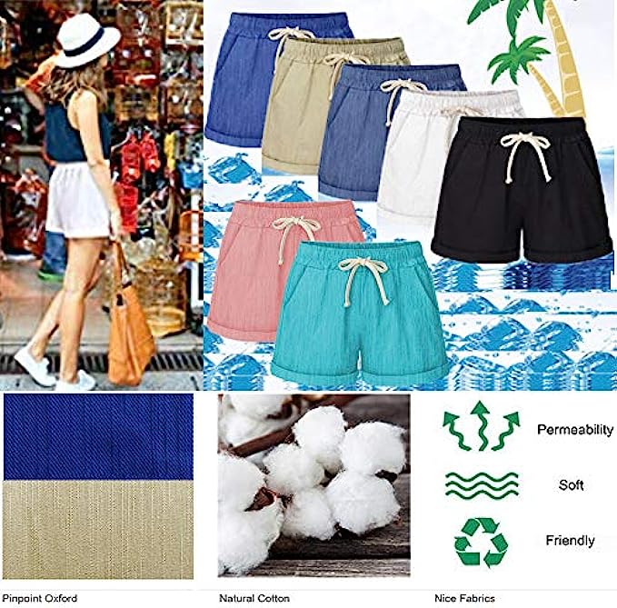 XinYangNi Women’s Elastic Waist Casual Comfy Cotton Beach Shorts with Drawstring
